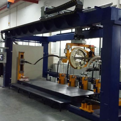包帶頭安裝于移動式龍門上,可在寬度方向(Y軸)及高度方向(Z軸)自動移動并隨龍門實現(xiàn)長度方向(X軸)移動??倷C由六個控制軸聯(lián)動控制以實現(xiàn)對三維線棒的最佳絕緣包帶。包帶頭進行了平衡設(shè)計以保證高速包帶時的穩(wěn)定性,可實現(xiàn)1盤包帶或2盤包帶,包帶張力可根據(jù)需要設(shè)定并實現(xiàn)恒張力。